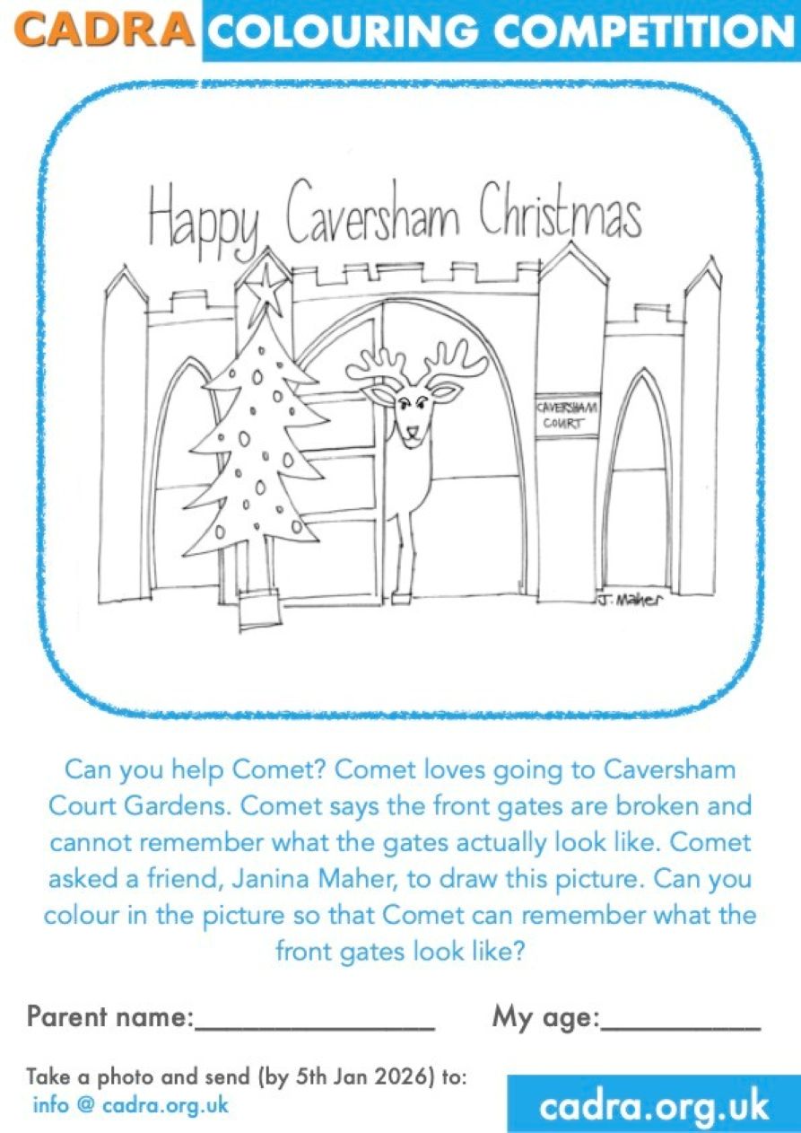 The picture for CADRA's Children’s Colouring Competition was drawn by local artist Janina Maher and shows Comet the Reindeer at the gates of Caversham Court Gardens. The prize for best entry is The Reading Detectives Book (or similar) and a water bottle from a local sports team. Please send your entries to info@cadra.org.uk by 5th January 2026.